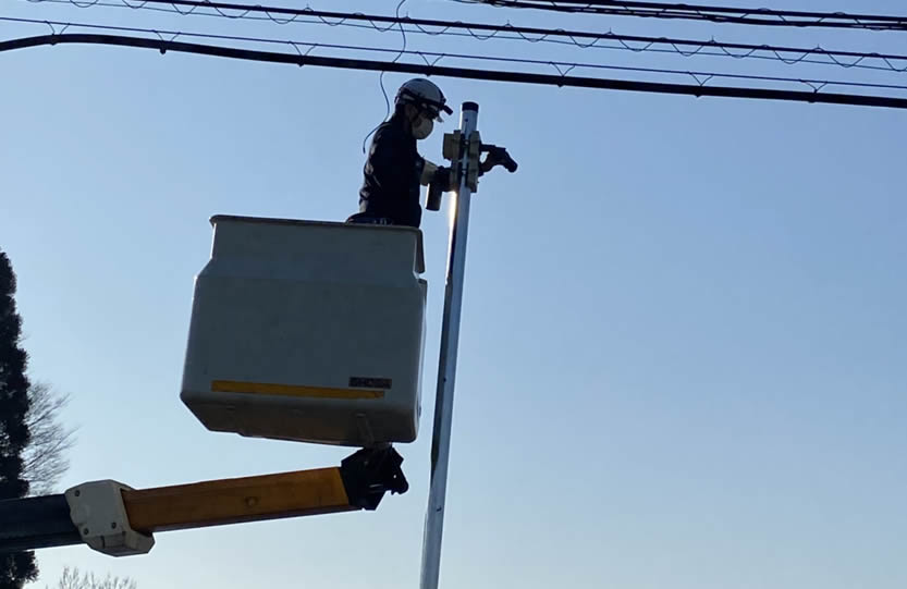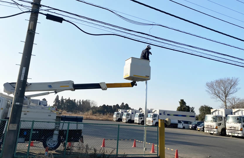 商店街や自治体などでは電柱に防犯カメラを設置したり、工場や倉庫など大規模な建物に関しては、こういった高所作業車を使って施工します。